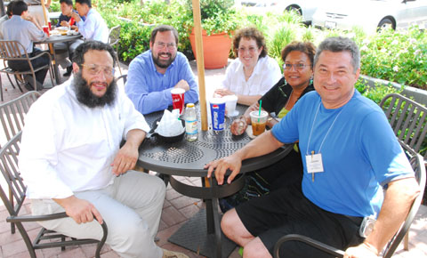 ![]() We found a Cafe across the street that sold Falafel, yum, yum! L to R, Mottel Baleston, Steven Ger, Jackie Fierman, Deborah & Jacob Cohen |