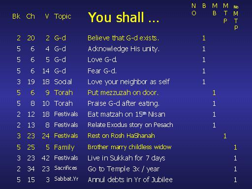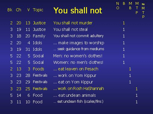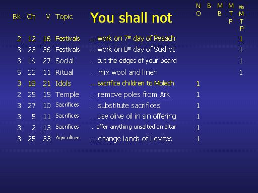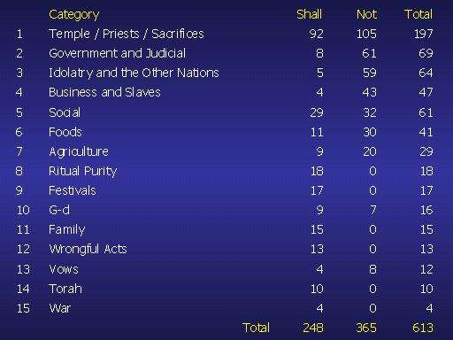 1 | Idolatry | 45 | 2 | Historical Events | 14 | 3 | Blasphemy | 7 | 4 | Temple | 22 | 5 | Sacrifices | 69 | 6 | Priests | 14 | 7 | Dietary Laws | 30 | 8 | Nazirites | 8 | 9 | Agriculture | 20 | 10 | Business & Slaves | 43 | 11 | Justice | 57 | 12 | Forbidden Relationships | 32 | 13 | The Monarchy | 4 |