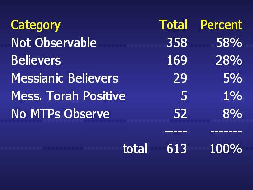 by Doug Friedman1 Different perspectives exist in the messianic movement on the applicability of the Mosaic Law to the New Covenant believer in our present Dispensation of Grace. Why is this subject so divisive, and can anything be done to bring healing to this division? At the AMC conference at Irvine, California in July of 2006, Doug Friedman sought to answer these questions by taking a fresh engineering look at this ancient theological divide and came up with a surprising answer that is both meaningful and relevant for today. Doug is an Associate Technical Fellow at the Boeing Company with over 40 years of experience in aeronautical engineering. He is also the founder and the Messianic Rabbi at Ben David Messianic Jewish Congregation in Orange, California. His presentation on the subject of the Mosaic Laws is a king's banquet for those of you who love to feast on statistics. But even if you don't, you won't miss coming away with a healthy, new perspective on what has been, until now, perhaps THE MOST DIVISIVE SUBJECT in the messianic movement. To appreciate Doug's full presentation, you'll need to take a step back from your current thinking on the subject and approach it with an open mind. Here's how I recommend you go about it: 1. Familiarize yourself with the graphics and tables below. 2. Listen to Doug's thirty-five minute audio presentation at this link while following along with the graphics and tables. The audio presentation may also be accessed by going to www.BenDavidMJC.org, then clicking on Sermons > The Torah > The Mosaic Laws, and scrolling down. 3. Below that, you'll find a spreadsheet listing "The 365 Mosaic Laws" for your thoughtful perusal either prior to, or following, the audio, and the PowerPoint slide show below that. 4. Here's a personal challenge from Doug: View the spreadsheet again and take "The Mosaic Laws Quiz." Go through the Laws one at a time, and note how many you do, and do not, observe to find out just how Torah observant you are. Doug Friedman and Editor * I. POWERPOINT IMAGES * II. ANALYSIS OF THE 613 LAWS
